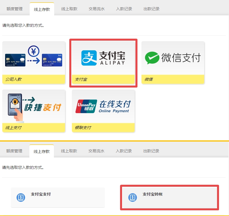 电脑用户点击右上角登入,登入会员账号,点击屏幕右上方的线上存款。再点击支付宝,选择支付宝转账