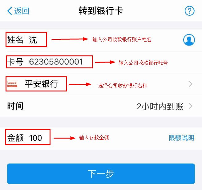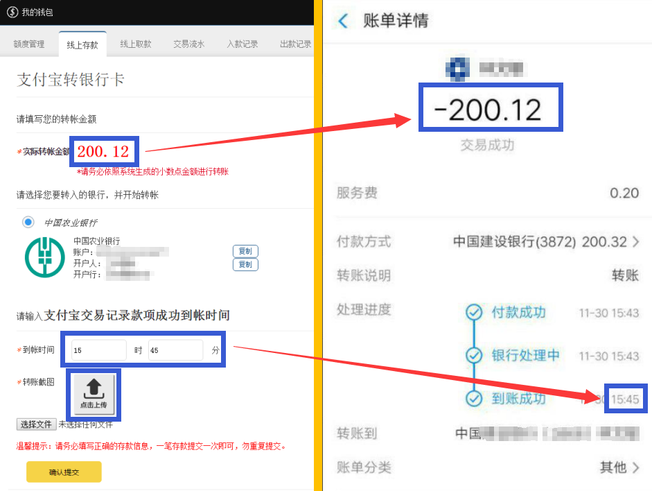 查看系统生成带有小数点的金额,记录好公司收款银行账户,使用支付宝进行转账(转账金额务必与带有小数点的金额一致);到账成功后按照提示填写到账时间,并上传您的转账详情截图,在点击确认提交(温馨提示:使用支付宝转账至平安银行是即时到账的; 务必先确认到账后,填写准确到账时间,再点击提交,否则财务人员查询不到款项无法第一时间帮您添加额度。)